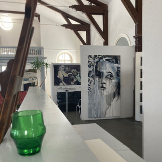 Großflächige Kunstwerke überfluten die Räume, dazwischen Vintage Möbel, eine kleine Küche, ein großer Esstisch, Farben und Staffeleien.